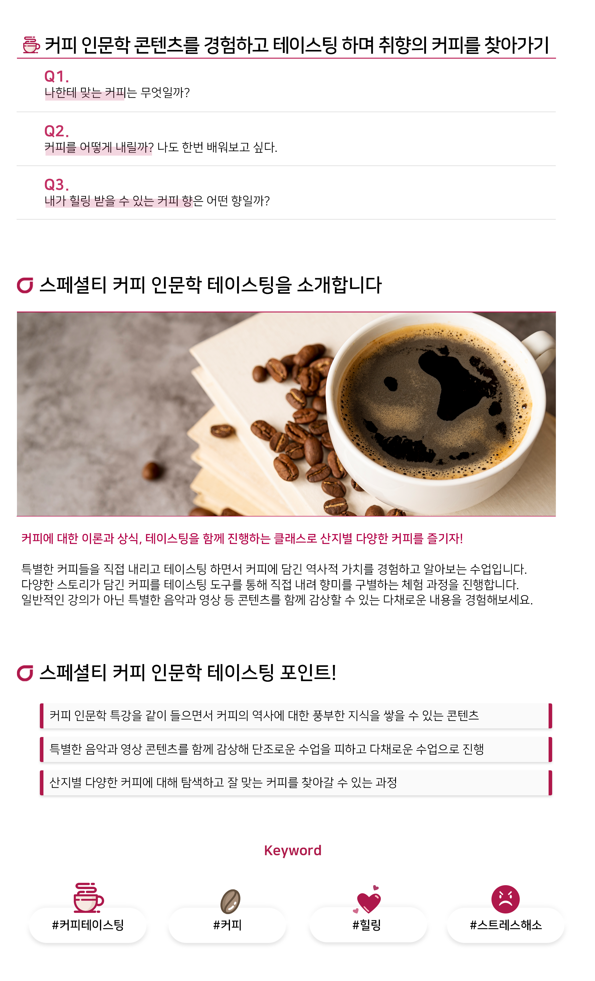 커피 인문학 콘텐츠를 경험하고 직접 내려 테이스팅 하며 취향의 커피를 찾아가기