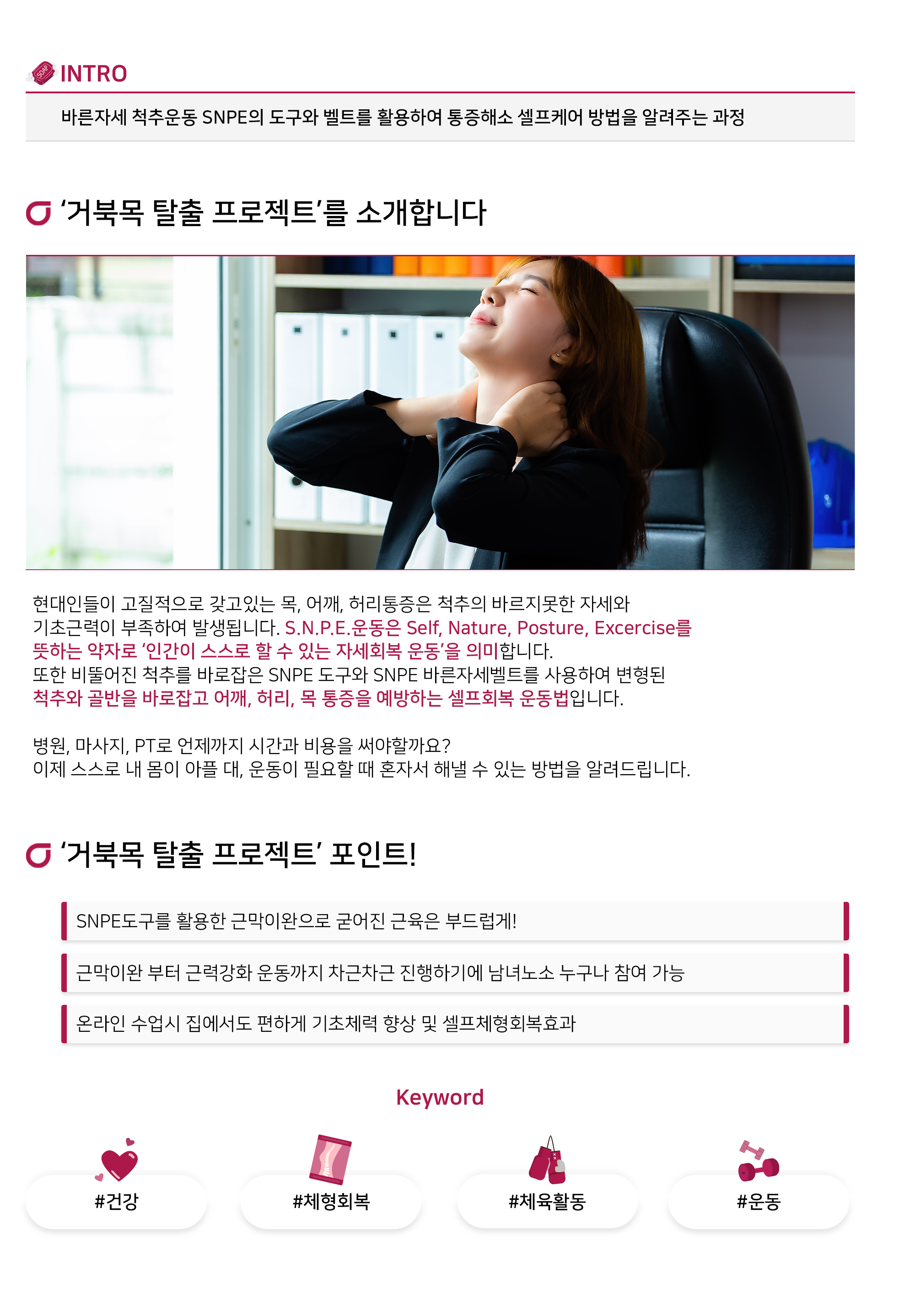 바른자세 척추운동 SNPE의 도구와 벨트를 활용하여 통증해소 셀프케어 방법을 알려주는 과정