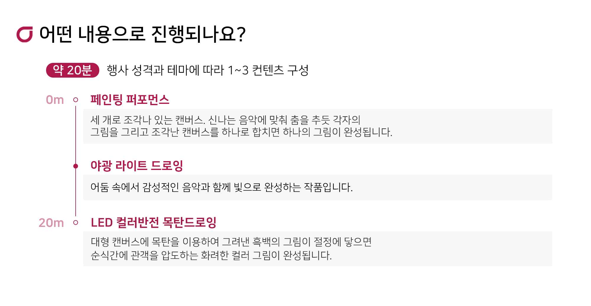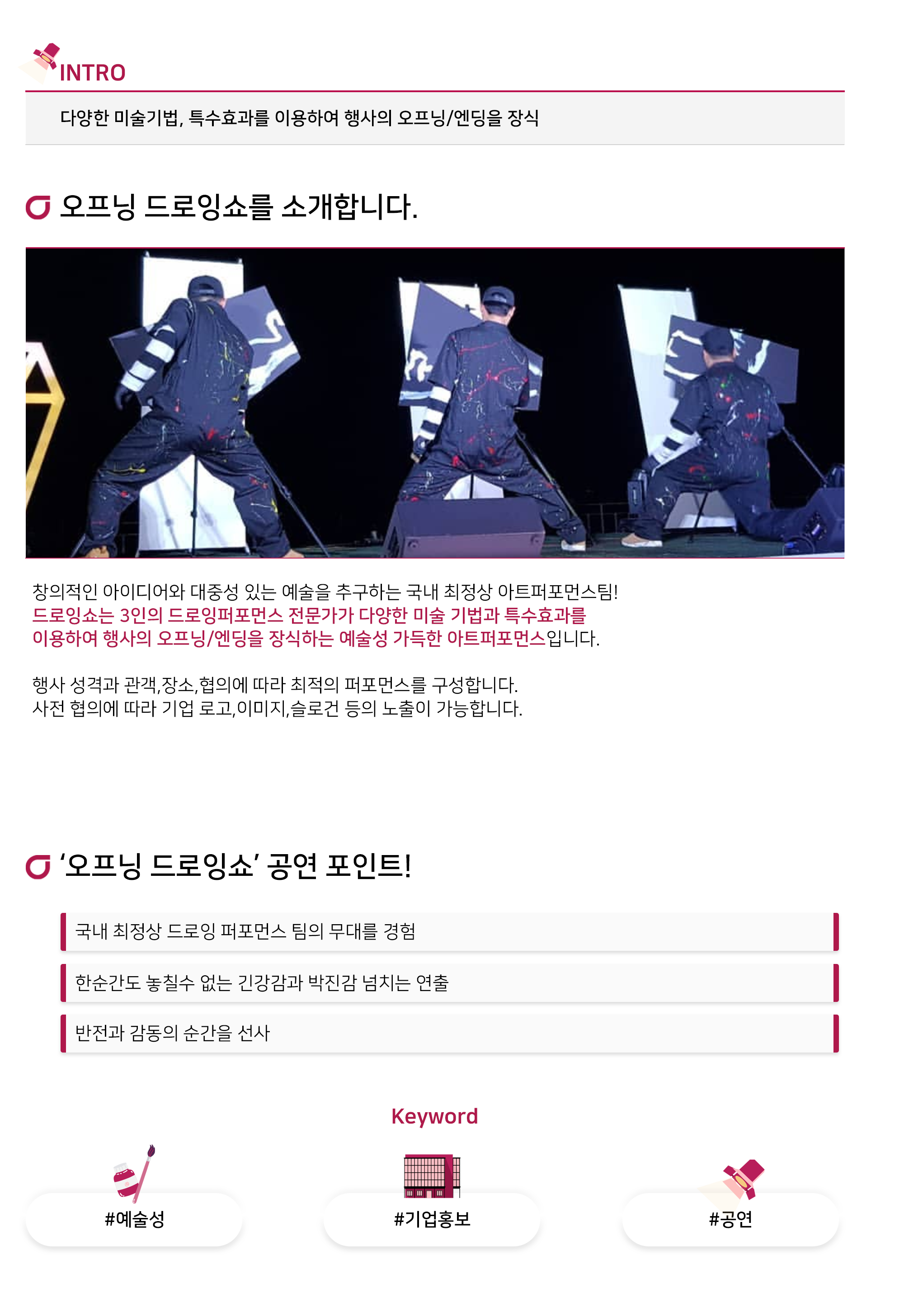 다양한 미술기법, 특수효과를 이용하여 행사의 오프닝/엔딩을 장식